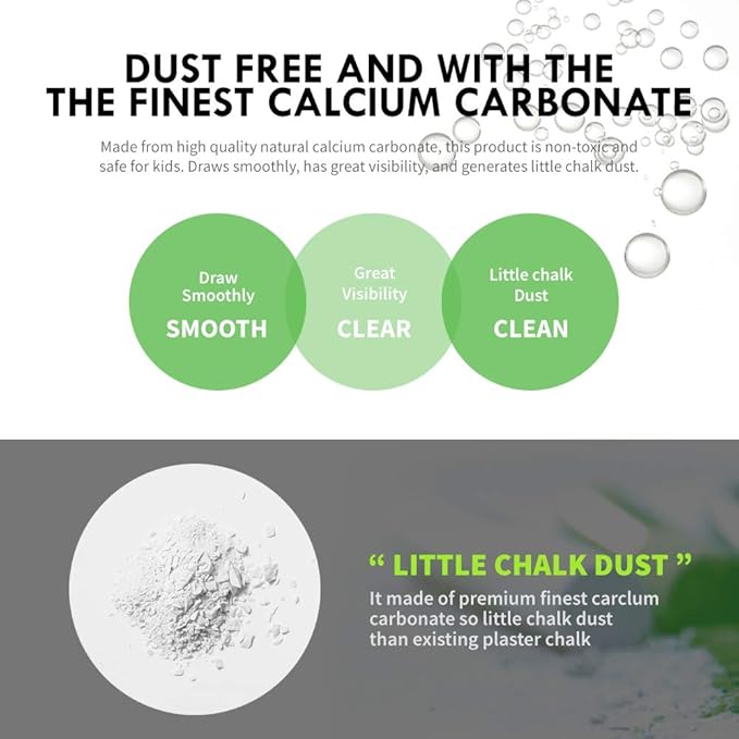 - NO MISTAKES: Our chalks erase easily leaving little to no residue on the chalkboard when removed. Chalk can be easily washed from most articles of clothing without leaving any unwanted permanent marks. Chalk generates little dust and fallout minimizing chances of smudging and messes when writing or drawing