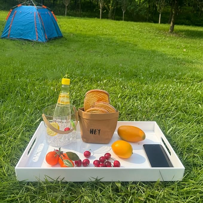 Glossy White Sturdy Acrylic Serving Tray with Handles-12x20 Inch-Serving Coffee Appetizer Breakfast-Kitchen Countertop Makeup Drawer Organizer-Vanity Table Ottoman Decorative Tray
