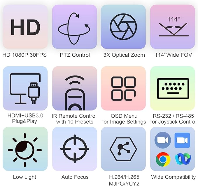 - ✔Multiple installation options and Package list - Available to install on the desk, wall, monitor, tripod, or ceiling. Package includes 1 * PTZ Camera, 1 * IR remote control, 1 * 9.8ft USB 3.0 cable, 1 * DC 12V/2A power adaptor, 1 * wall bracket with screws, and 1 * manual.