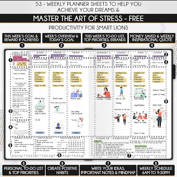 - LIFE PLANNER - A5 Size, 212 pages of life transformation, 53 weekly, 12 monthly planning overviews & reflection, 22 dotted journal pages, habit trackers, mind maps, morning & evening routines, inner pockets, pen holder & gift box