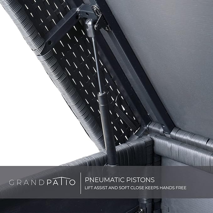 - UNIQUE DESIGN: Children friendly two pneumatic pistons for easy lift and soft closure, a feature you will appreciate when you have your hands full. Combined with water risistant widened lid to protect your belongings better, meanwhile you can open outdoor wicker storage easily by front pull. Holes at bottom of patio storage box for good ventilation to keep inside clean.