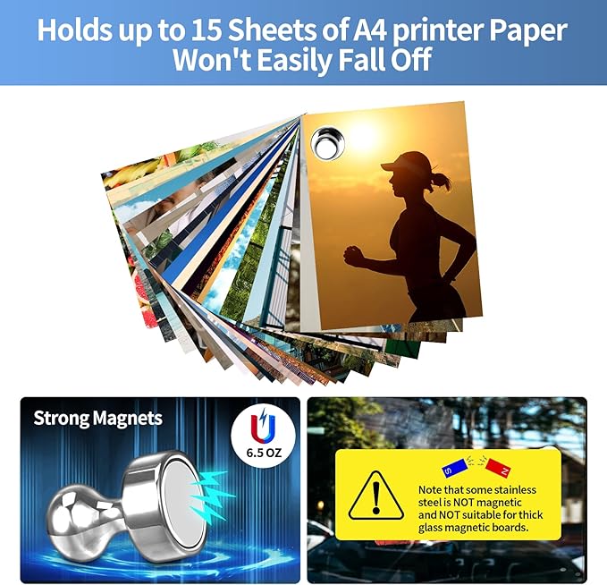 - đ»ăStrong Fridge MagnetăDo not be fooled by these magnets for whiteboard, They can hold up to 15 sheets of A4 printer paper at once with just a tiny magnet. Even possible to use them in the kitchen to hold cooking tools that weigh no more than 6.5 OZ and the cooking tools won't easily fall off.