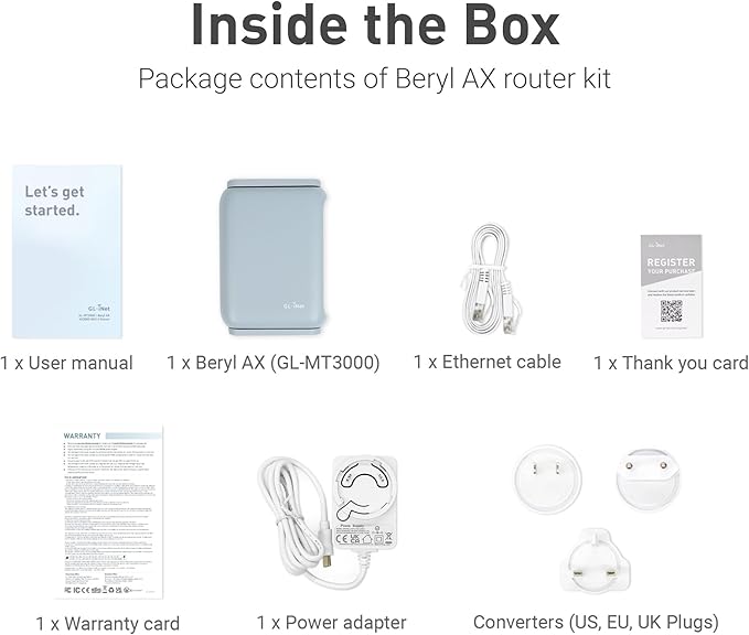 - Included Components : Ethernet Cable, GL-MT3000 (Beryl AX) router with 2-year warranty, Power Adapter (US Plug, UK Plug, EU Plug), User Manual Ethernet Cable, GL-MT3000 (Beryl AX) router with 2-year warranty, Power Adapter (US Plug, UK Plug, EU Plug), User Manual