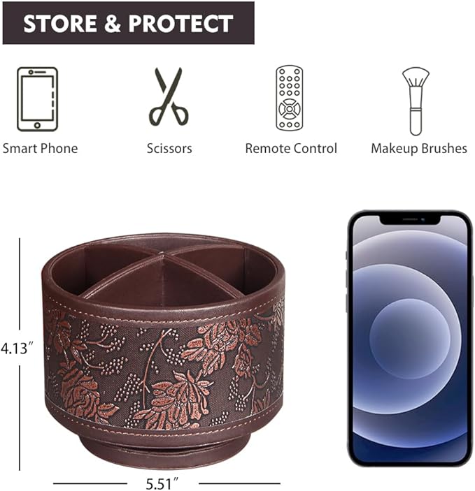 360° Rotating Pen Holder for Desk, Leather Pencil Pen Organizer Remote Control Holder Table Desktop Nightstand Organizer Caddy Storage, Office Desk Organizers And Accessories 5.5x5.5x4.0 Inch