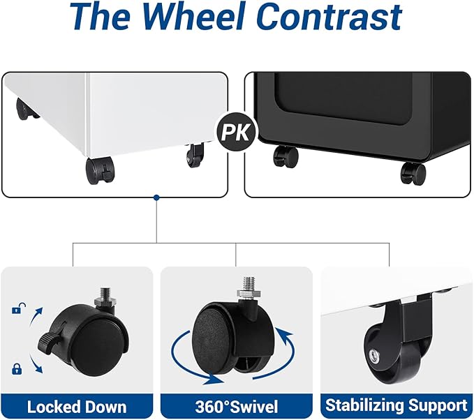 - CAN BE PLACED EVERYWHERE - Thanks to the compact design and five flexible wheels of this filing cabinet, you can easily putting it under the desk, next to the sofa, in the bedroom to using as a under desk file cabinet, a bedside tables etc.