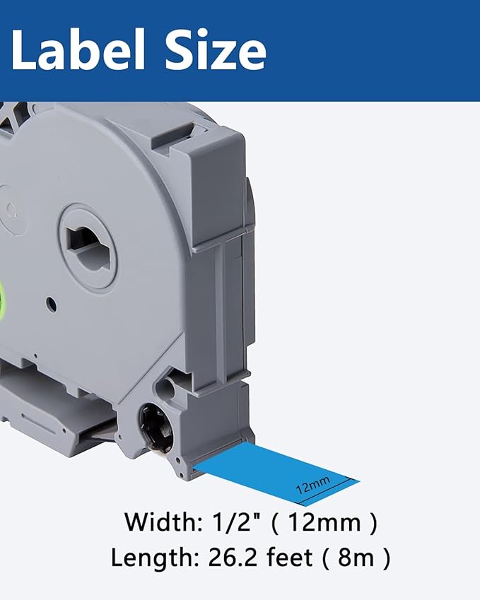 - Size - 1/2" width x 26.2' length ( 12mm x 8m ) each 12mm label maker tape. Color - Black ink on blue tape
