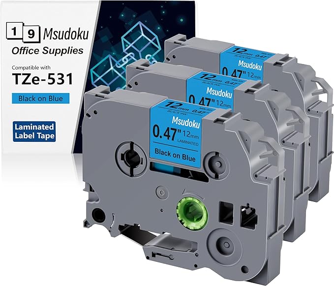 - These compatible for brother label maker tape 12mm 0.47 TZe-531 TZe531 have strong adhesive and no sticky residue when you remove it. The split back design of ptouch label tape 12mm blue tape is very easy to peel off