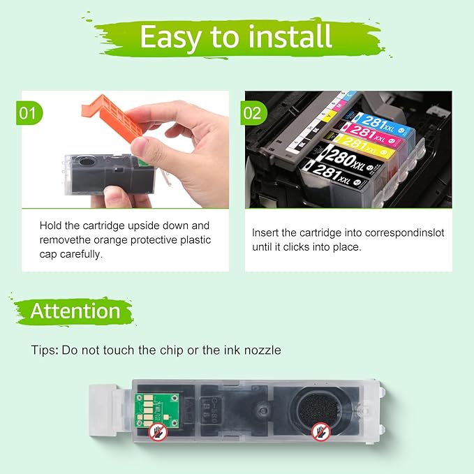 - 【Package Contents】Compatible Canon 280 and 281 ink cartridges: 1 x PGI 280XXL Pigment Black (PGBK) , 1 x CLI 281XXL Black, 1 x CLI 281XXL Cyan, 1 x CLI 281XXL Magenta, 1 x CLI 281XXL Yellow (Total 5 Pack)