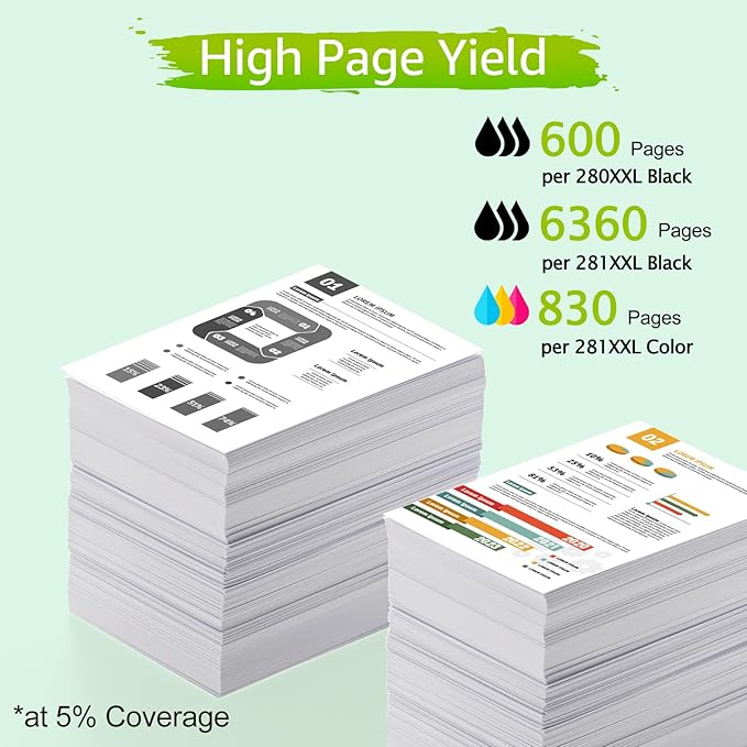- 【High Page Yield】600 pages per 280XXL Pigment Black (PGBK) cartridge, 6360 pages per 281XXL Black cartridge, 830 pages per 281XXL color cartridge at 5% coverage. (Letter/A4)