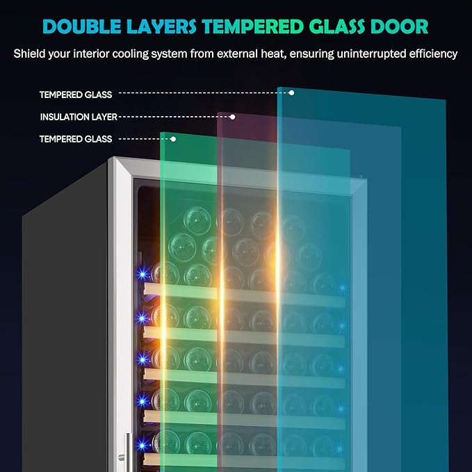 - 【Double-Layer Glass Door and Safety Lock Design】The wine cabinet features a double-layer tempered glass door, presenting a visually appealing wine display. This design effectively insulates against external temperature fluctuations, ensuring wines remain in optimal storage conditions. The safety lock adds an extra layer of security for your valuable collection.