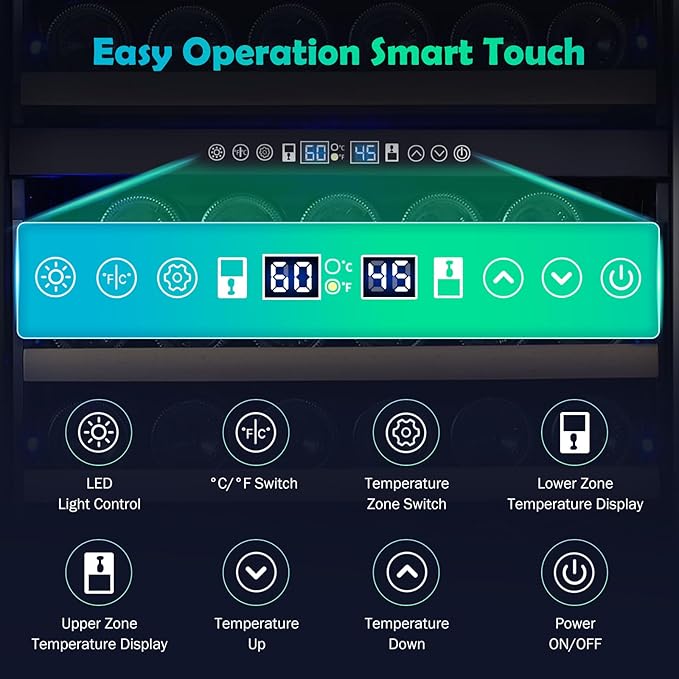 - 【Advanced Compressor Cooling and Circulation System】The ORYMUSE large dual-zone wine refrigerator employs cutting-edge compressor technology and a robust circulating fan, delivering rapid, powerful, and stable cooling. The internal upper and lower zone air circulation system ensures even distribution, allowing you to store different wines according to specific temperature range needs. Adjustable temperature range for the upper zone: 40-55°F (5-13°C), lower zone: 55-65°F (13-18°C).