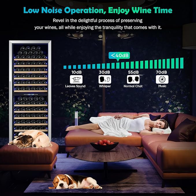 - 【Beechwood Shelf Design】The ORYMUSE wine fridge features 15 beechwood shelves, accommodating up to 200 standard Bordeaux (750 ml, thickness ≤ 2.75'') Wine bottles. With a spacious bottom design, it accommodates various wine types. Beechwood ensures strong stability, humidity control, and durability, and is environmentally friendly and healthy.