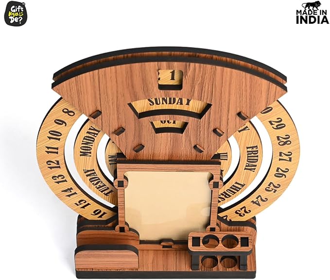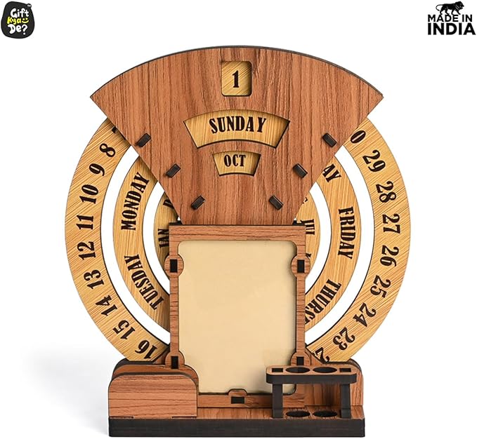 - Designer Home Decor: The beautiful designer calendar 2025 , where you can keep your photo, pen, and cardholder that serve as the perfect piece of home and office decor. Three individual circular rings dedicated to dates, days, and months are placed in an indigenous manner, which may be rotated very easily and precisely to change days, dates, and months to give you a new day every day. This calendar for desks is not limited to any particular year.