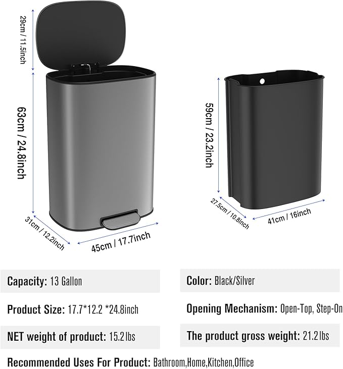 - LARGE CAPACITY TRASH CAN: 12.2''L×17.7''W×24.8''H, 13.2 gallon(Please Note: Due to the curved angle edges of the box, manual measurements may have a slight error, and the actual size may be slightly larger). The huge capacity definitely meets your daily use, this can fits most brands of 13 gallon trash bags. It can be a good helper for your kitchen & make your room clean and tidy. The sophisticated oval appearance also makes it suitable for a variety of occasions.