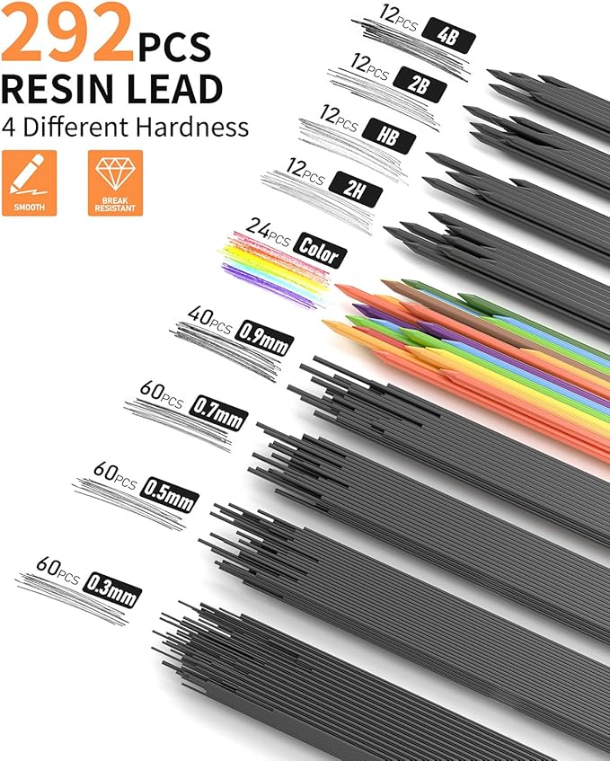 - Exquisite Artist Set: Includes 5 PCS metal drawing mechanical pencils (0.3, 0.5, 0.7, 0.9, 2.0mm), 4 tubes of 0.3, 0.5, 0.7, and 0.9mm graphite lead refills, 4 tubes 2.0mm (4B, 2B, HB, 2H,) graphite lead refills, 2 tubes 12 color lead refills, 2pcs 4B soft erasers, a kneaded eraser, a gum eraser, 2pcs lead sharpener, 9pcs cap eraser refills, a plastic case.