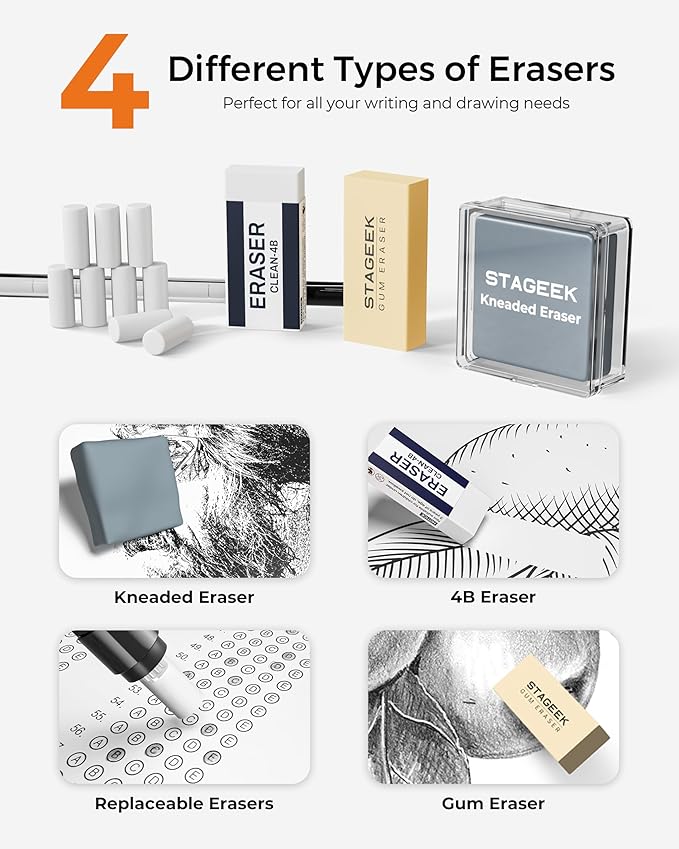 - Durable Erasers & Sharpeners: The pencil set includes 2 high-quality 4B erasers, 1 kneaded eraser, and 2 tubes of eraser refills (9 pieces/tube) for clean, precise corrections. 2 double-hole lead sharpeners are included for versatile tip maintenance, while each 2.0mm pencil cap features a built-in sharpener for quick on-the-go adjustments