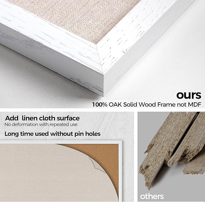 - Oak Frame Material: Our cork boards for walls is made of 100% oak wood which has well self-healing ability and repairability. The pin board features a four-ply splint design that is strong and thick enough not to be punctured by thumbtacks.