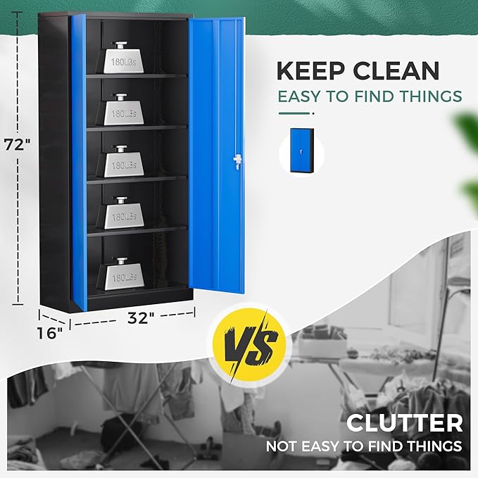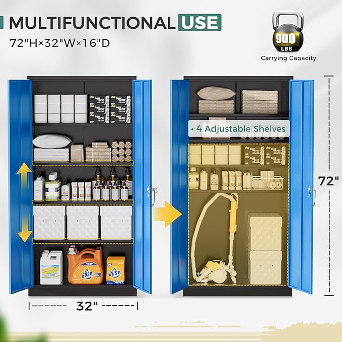 Greenvelly Metal Garage Storage Cabinet, 72" Tall Steel Storage Cabinets with 2 Doors and 4 Adjustable Shelves, Metal Tool Cabinets, Locking File Cabinet for Home Office, Garage, School (Black Blue)