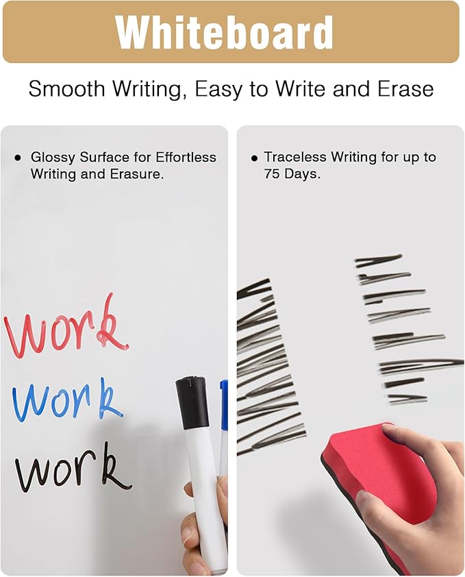 - đâăDurable Whiteboard Surfaceă: The high-quality whiteboard surface allows for repeated writing and erasing, ensuring long-term clarity. Its smooth surface enables easy, ghost-free erasing, keeping your board looking clean and professional.