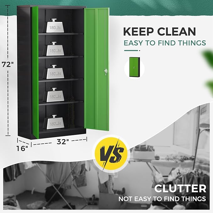 - [Big Size & Large Storage]:Greenvelly (72”)steel storage cabinets have a popular size (72*32*16),and each one has four adjustable shelves inside, which can be adjusted according to the height and size of the storage goods. This lockable storage cabinet is suit for many scenes,such as garage,home,office,school,etc.