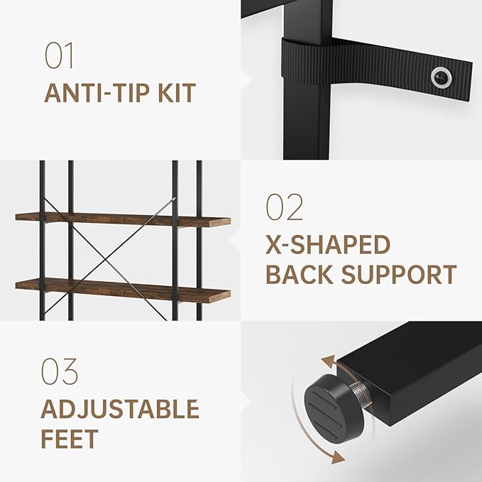 - Stable and Durable: Our four-tier industrial bookshelf is capable of holding heavy items securely. The matte black steel frame includes X-shaped support, adjustable feet, and two anti-tip devices, ensuring enhanced stability and durability