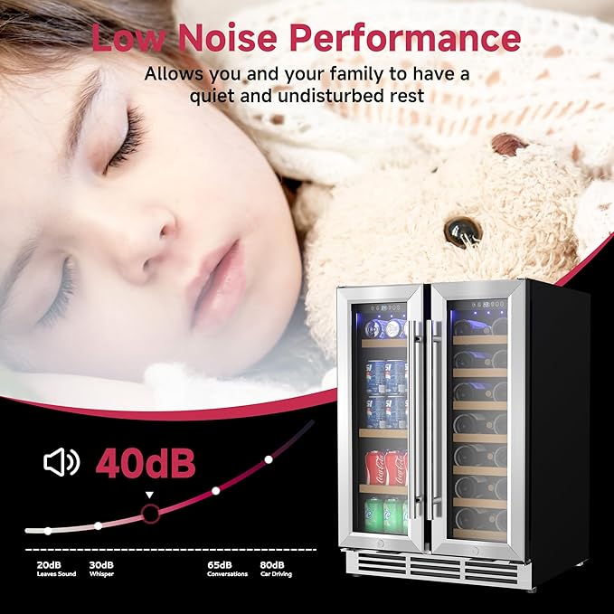 - Dual Use Wine & Beverage - The wine and beverage refrigerator is designed with two separate zones with independent temperature control. The left beverage zone is 35°F-50°F for juices and colas, while the right wine zone is 40°F-66°F for red wines and champagnes. The large capacity of this wine refrigerator can easily hold 21 bottles of wine and 80 cans of 330ml beverages. The wine cooler has 7 wooden shelves and 3 removable wire shelves that you can adjust up or down as you wish.