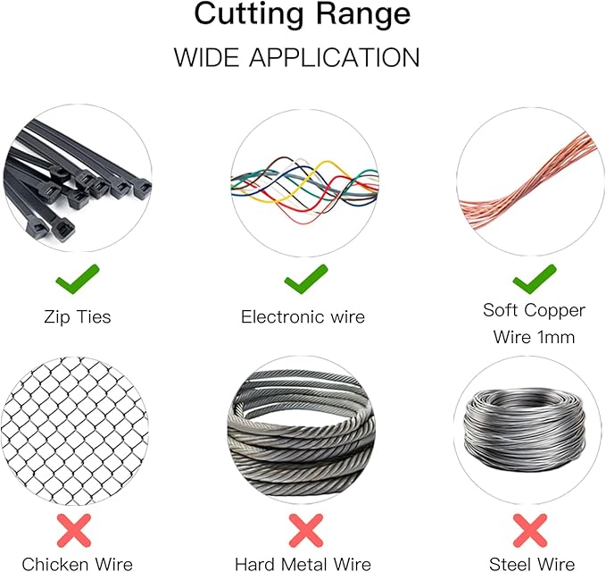 - Application - Can be used for cutting electronic component pins for trimming in tight areas, as well as cutting soft copper wire, soft iron wire, injection gate flashing, heating wire, etc. It can also be used for manual DIY, jewelry processing, model cutting and fishing. Please do not use the cutting pliers to cut objects beyond its cutting capacity, like hard metal, otherwise the cutting edge might be broken and cause irrecoverable gaps.