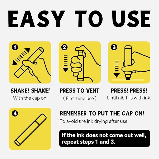- Safety First – Our graffiti paint markers are non-toxic, Each thick permanent marker meets ASTM d-4236 and EN-71 safety standards, are suitable for artists of all ages, working seamlessly on rock, fabric, glass, wood, plastic, paper, and more