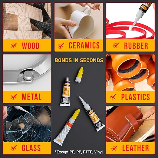 - Super Glue all purpose: GMSA super-strong instant glue adhesive works wonders on a variety of materials, making it perfect for ceramic repairs in Wood, pottery, jewellery, plastic, rubber, paper, leather, metal, shoes and much more, ensuring lasting results.