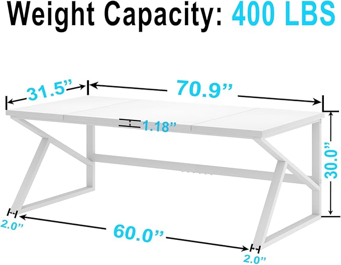 - 【Spacious Work Space & Leg Room】: Measuring 31.5"D x 70.8"W x 29.5"H overall, this long white desk offers ample space to accommodate multiple monitors, pc, laptop, printers, files, books, lamps and any other office essentials, ensuring you have everything you need within arm's reach for enhanced productivity. The desktop is crafted from three meticulously joined panels, creating a cool cross-grain effect. Featuring two K-shaped metal legs with an open structure, this large computer desk for home office provides ample leg room, promoting comfort during extended periods of use.