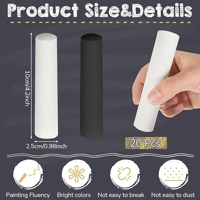 - Ample Quantity for Fun: our package includes 20 pieces of jumbo sidewalk chalks, coming in 2 different colors, black and white, 10 pieces per color, offering fun creativity; This means you will not have to worry about running out chalk in the middle of your art masterpiece or a fun afternoon of play, suitable for schools, playgroups, or other activities