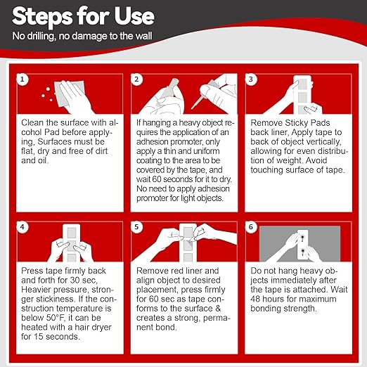 - 【Usage Tips】 1. Pressing: The greater the pressure, the stronger the stickiness 2. Time: The longer the time, the stronger the stickiness. Wait for 48 hours before hanging heavy objects 3. Temperature: When the construction temperature is low, please use a hair dryer to heat it up. The pressure-sensitive adhesive system of the sticky tape has high initial adhesion, ensuring rapid