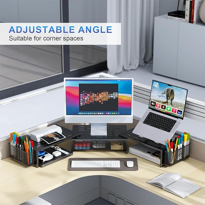 - 【Easy to assemble】: The desk shelf can be placed in just two minutes, without screw assembly, saving your time. The computer stand has ventilation holes to prevent overheating and keep the equipment running cool