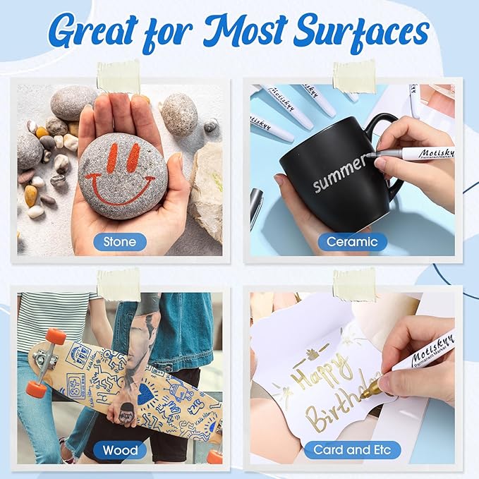 - Nice for Most Surfaces: these metallic markers work well on most surfaces, such as paper, wood, enamel, chalkboards, canvas, wood, brick, stone, glass, mirrors, windows, metal, plastic, ceramic, fabric, etc.; Decorate your clothes, gift bags, shoes, and personalize coasters, coffee mugs, journals and other crafts
