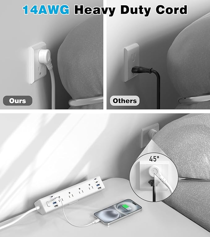 - 【45° Flat Plug & 14AWG Heavy Duty Power Cord】The 45° flat plug allows easy access to wall sockets, even in tight spaces or behind furniture. Comes with a 14AWG heavy duty 10Ft power Cord. Adopting pure copper wire core to prevent equipment overload and short circuit, it can protect your equipment well.