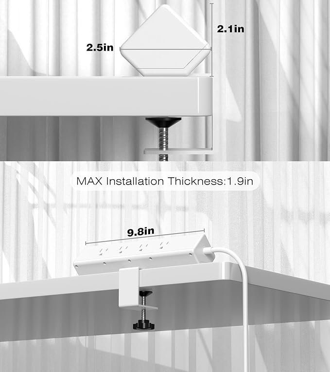 - 【Desk Clamp Power Strip with Surge Protection】Constructed from fire-resistant ABS plastic, this power strip offers a 1200-Joule surge protection rating with a built-in circuit breaker to guard against overloads, short circuits, and overheating. Effectively handles voltage spikes to keep your computer and other accessories safe.