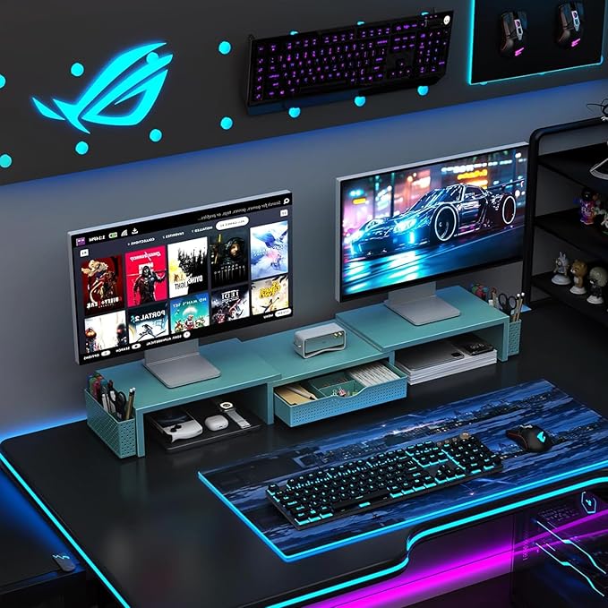 gianotter Dual Monitor Stand Riser, Desk Organizer With Drawer and 2 Pen Holders, Monitor Stand for Desk, Office Decor Essentials (Blue)