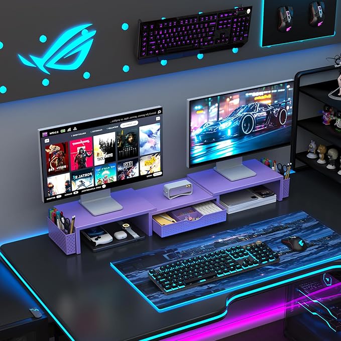 gianotter Dual Monitor Stand Riser, Desk Organizer With Drawer and 2 Pen Holders, Desk Organizers and Accessories, Purple Office Decor (Purple)