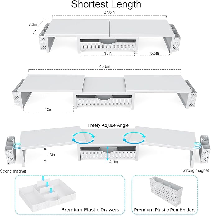 - 【Ample Storage Space】The dual monitor stand features two magnetic pen holders and a drawer, allowing you to easily organize your desk accessories and office supplies, keeping your workspace clear and tidy for easier access.