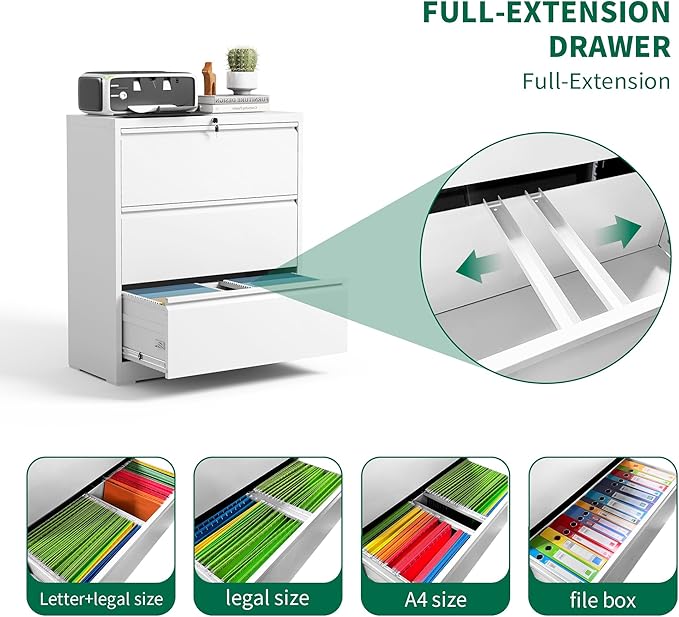 3 Drawer Lateral File Cabinet, Metal Filing Cabinets for Home Office, Steel Storage Wide File Cabinet for Letter/Legal/F4/A4 Size with Hanging Bars, Assembly Required (White)
