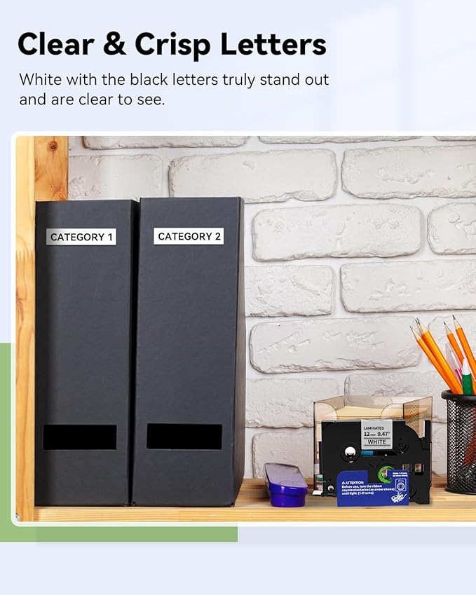 - Versatile Labeling: White label tape are an effective option for use on smooth and textured surfaces. Ideal for organizing cables, files, shelves, and more with crisp black text on white label tape