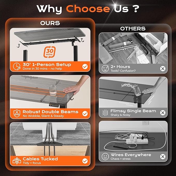 - 【Whisper-Quiet Operation】Powered by a robust yet quiet motor (operating at less than 45 DB), the wide deep desk brings smooth height adjustments without disturbing your household or office environment. This standup desk for home office is ideal for keeping focus and slient