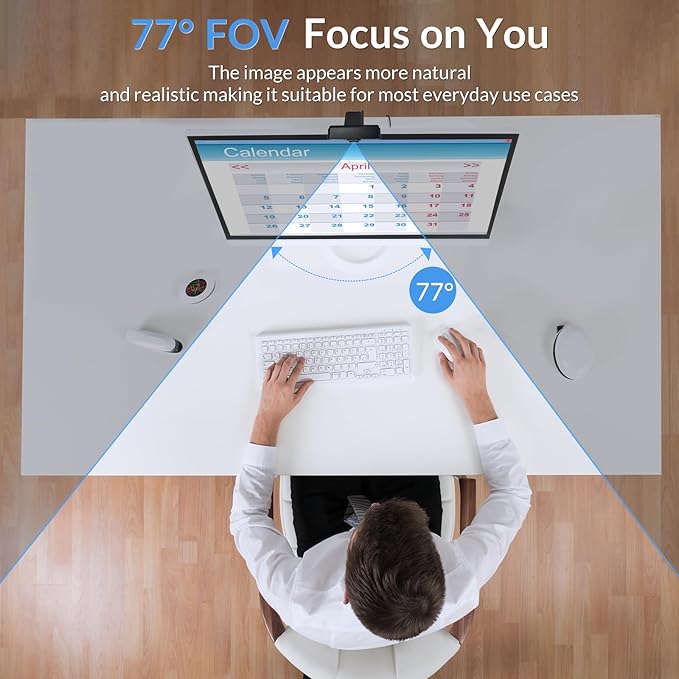 - [Dual Microphones with Noise Reduction] – Built-in dual mics intelligently filter out background noise and pick up clear audio within 3 meters. The 77° wide-angle lens supports natural framing for 3–5 people, making it an ideal streaming camera or webcam for Mac for team calls and video chats.
