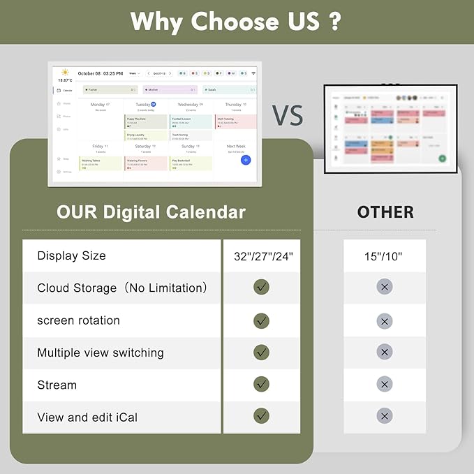 - ☪Also a Digital Frame with Unlimited Cloud Storage: This multi-functional electronic calendar does more than organize your schedule—it also serves as a 32GB digital photo frame to display your favorite memories. With unlimited cloud storage, you can upload endless photos without worrying about space. An energy-saving sleep mode adds eco-friendly convenience. Ideal for home or office, it blends organization with meaningful décor.