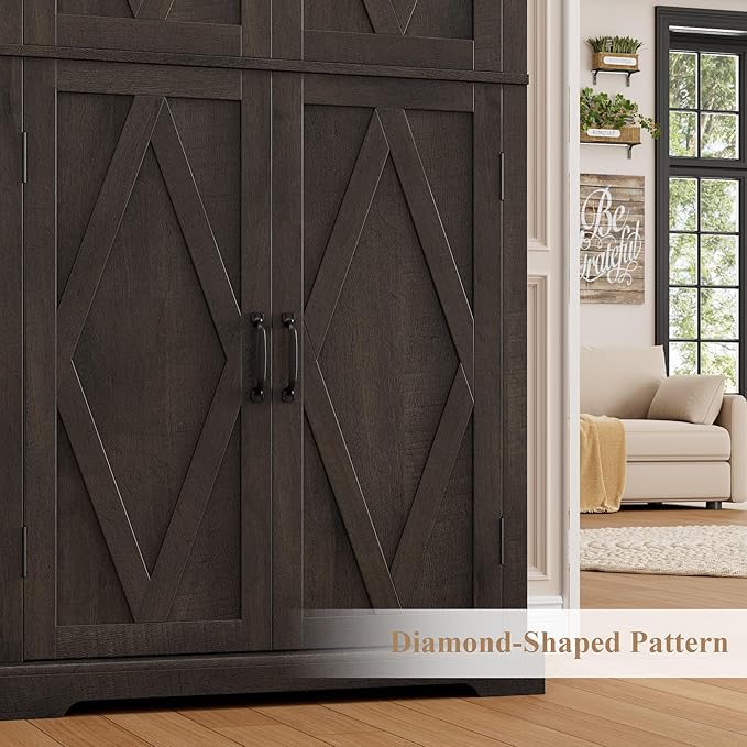 - Charming Pantry Cabinet: With the combination of a dark brown tone and wood grain in simple silhouette, the tall storage cabinet gives off fully modern farmhouse charm. Decors of rhombus on doors and strings on side panels enrich the look and make the pantry an eye-catching complement to any space