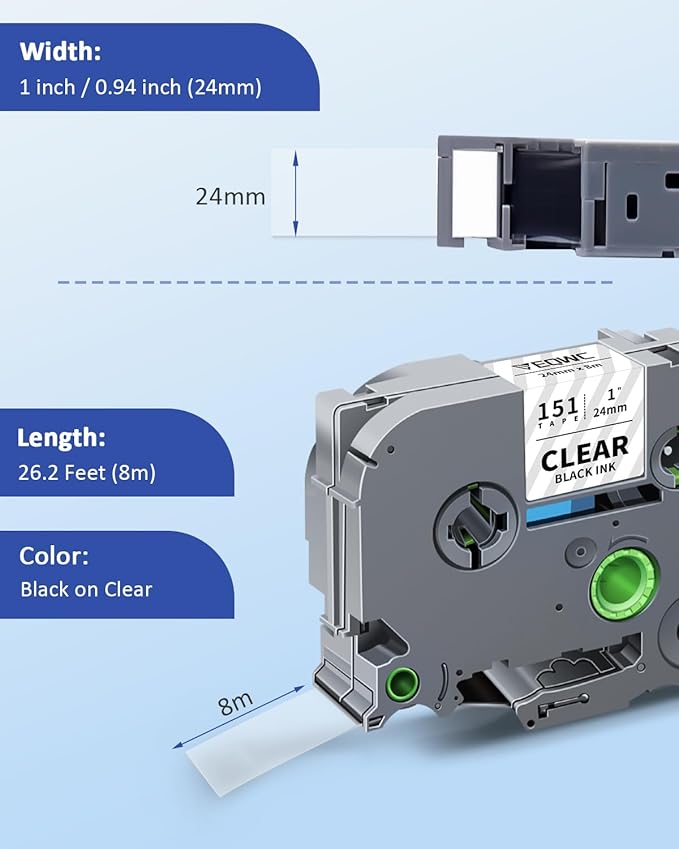 - Package Included: 4 Pack replacements compatible for Brother Ptouch label maker tapes TZe151 (TZ-151 TZ151). Dimensions: Each pack measures 1" (0.94") in width and 26.2 ft (8m) in length, totaling 48 meters across all packs. Color: Black on Clear