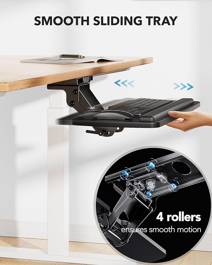 - Maximize Desk SpaceοΌStore your keyboard and mouse on the tray, then slide this keyboad tray under the desk when not in use to free up 30% more desk space, perfect for offices, home offices, gaming setups, or cluttered workspaces. Pro Tips: loosen the knob, align the tray parallel to the desk, then tighten the knob for smooth sliding and rotation