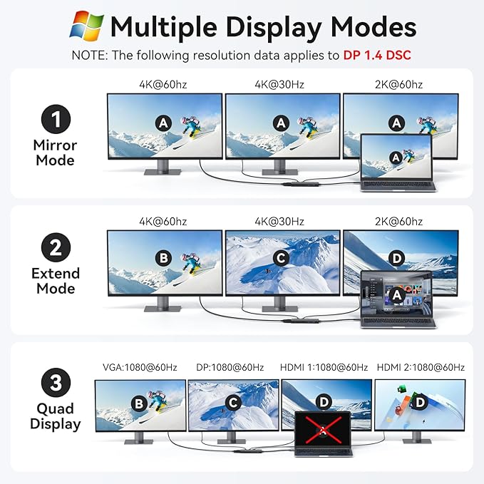 - Laptop Docking Station 4K Display Adapter: The USB C Docking Station Dual HDMI Splitter with 4 video output ports: 2 HDMI+DP+VGA. For single display, HDMI can reach 8K@30HZ or 4K@144HZ; For dual display and triple display, Can output up to 4K Dual/Triple Display videos(For laptop with DP 1.4 DSC); For quadruple display, Dual HDMI, DP, and VGA all are 1080@60Hz. Please make sure your laptop specification support DP1.4 signal output. If the VGA port is connected, it will affect the resolution of all displays up to 1080P only