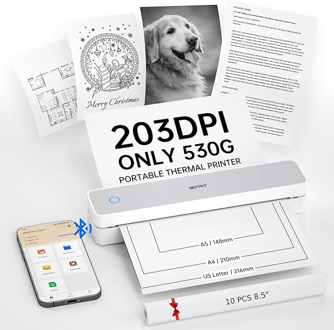 - Inkless Printing Technology: This advanced bluetooth printer utilizes thermal technology, no ink cartridges needed! With a resolution of 203 DPI, clear printing and high speed—completing a US Letter/A4 page in just 4-6 seconds. ( Note: Supports black-and-white printing exclusively and requires thermal paper. )