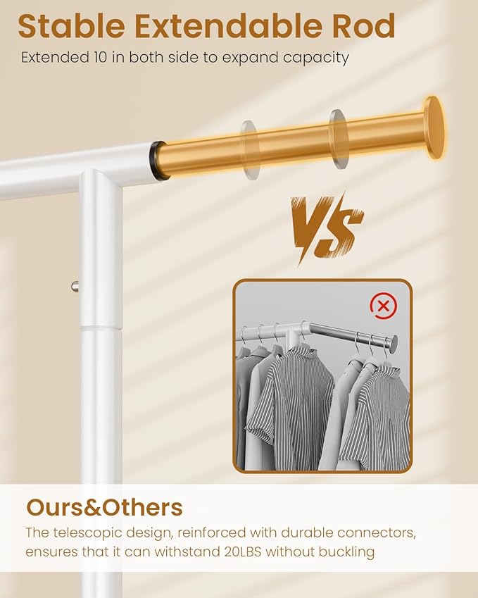- ๐ผ๐ฟ๐ ๐๐๐๐ผ๐ฝ๐๐ ๐๐๐๐๐๐: The heavy duty clothes rack features a user - friendly adjustable design. The horizontal rod extends from 43in to 63in. This adaptability makes it perfect for any space such as living room, bedroom, laundry, yard sales, clothing live streaming, shopping malls and so on.